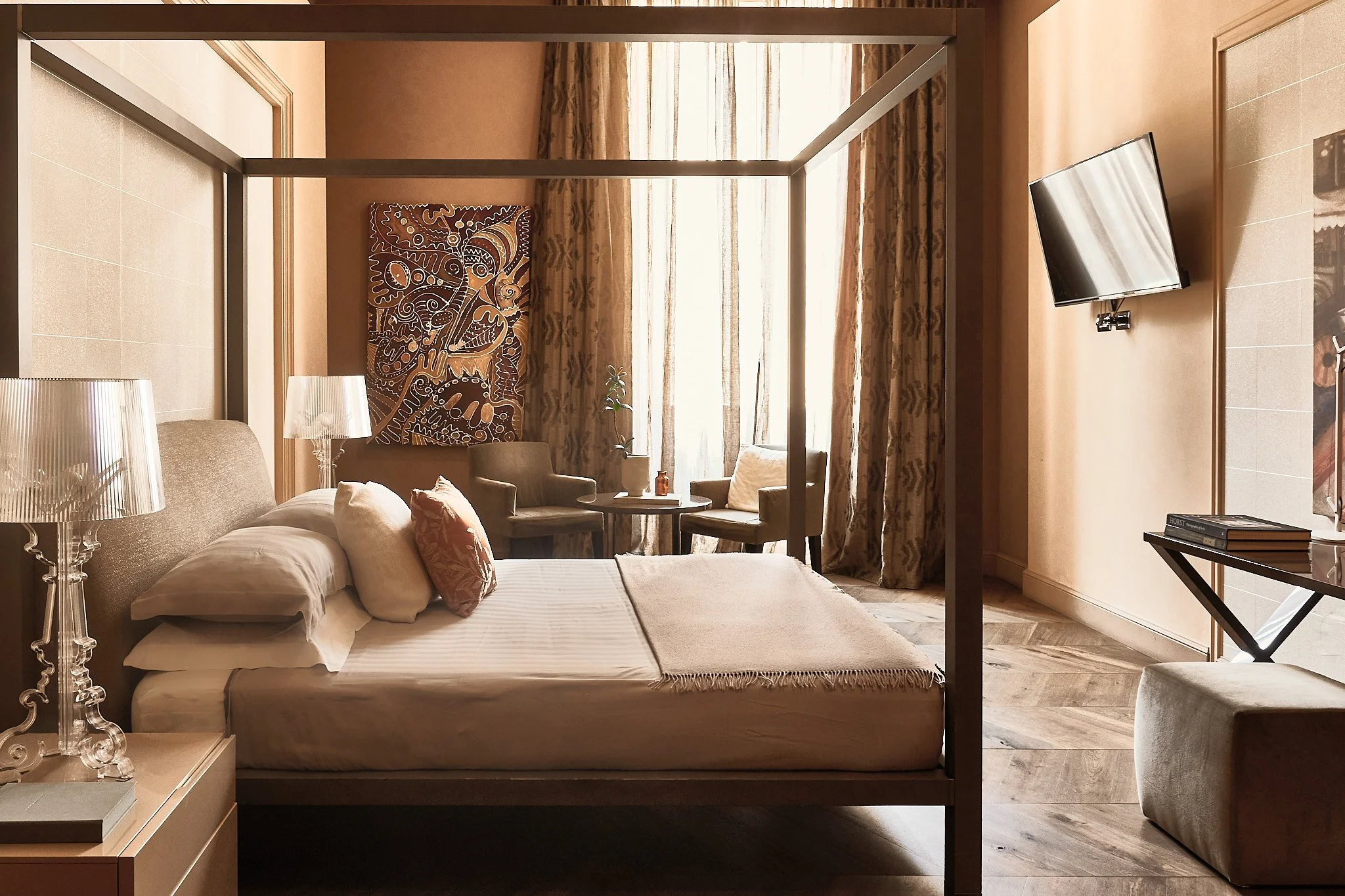 Beautifully designed in a modern style that blends in with the antique feeling of the house, this sleek studio provides great space and elegant comfort. Stepping out onto the room’s private balcony will make you feel completely immersed in the city. Basic occupancy is set for two, one additional guest can stay in a rollout single bed.